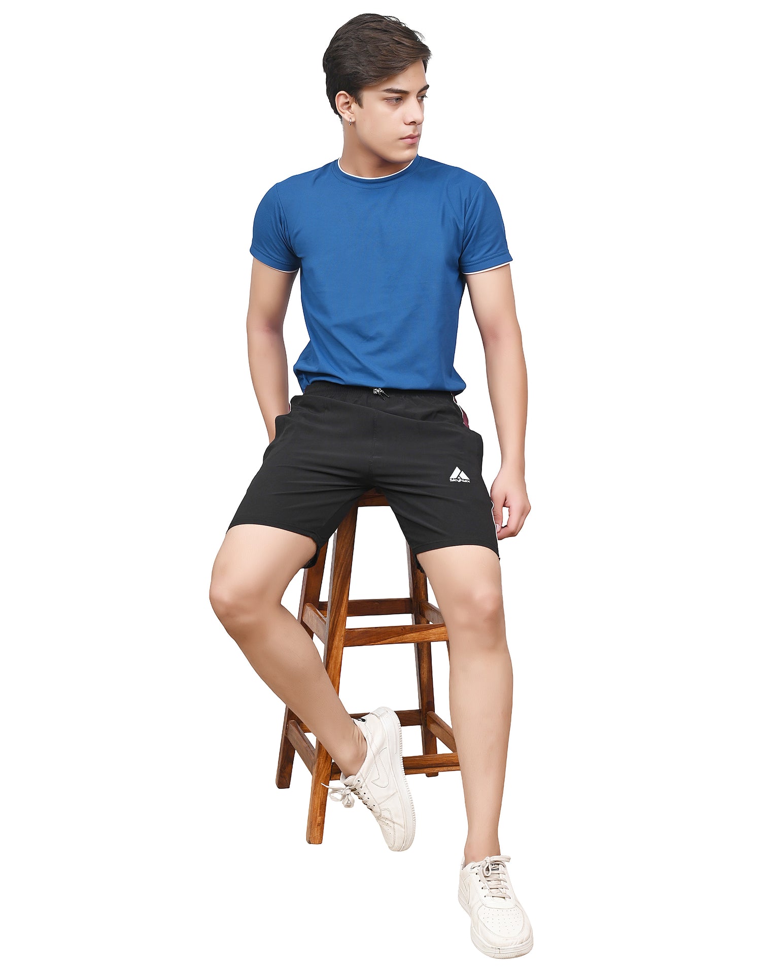 Men's Sports Shorts – Black with Dark Blue Side Panel – Lightweight Activewear with Pockets